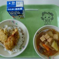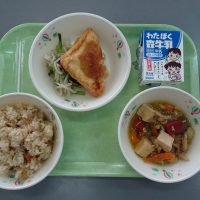 しょくいくのひ しがけん しょいめし はんぺんチーズフライ もやしのソテー かしわのじゅんじゅん 牛乳