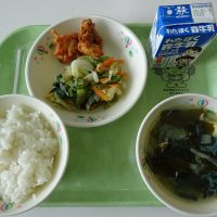 せかいのりょうり かんこく ごはん ヤンニョムチキン チョレギサラダ わかめスープ 牛乳