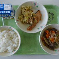 ごはん キャベツとあぶらあげのごまいため さけのさいきょうやき いりどり 牛乳