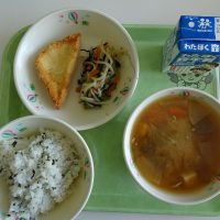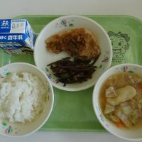 わかめごはん さんしょくやさいのいためもの はんぺんチーズフライ けんちんじる 牛乳