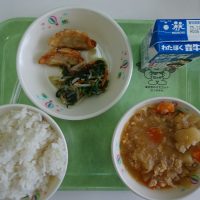ごはん ほうれんそうともやしのナムル あげぎょうざ かんこくふうにくじゃが 牛乳