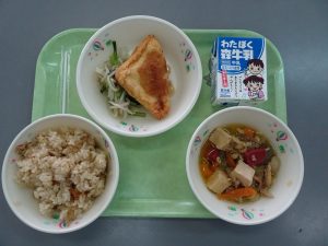 しょいめし はんぺんチーズフライ もやしのソテー かしわのじゅんじゅん 牛乳