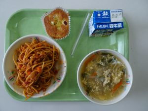 スパゲッティボロネーゼ てづくりさつまいもマフィン あさりとたまごのスープ 牛乳