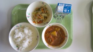 今年度の最初の給食は、カレーライス、春雨入り野菜炒め、牛乳です。